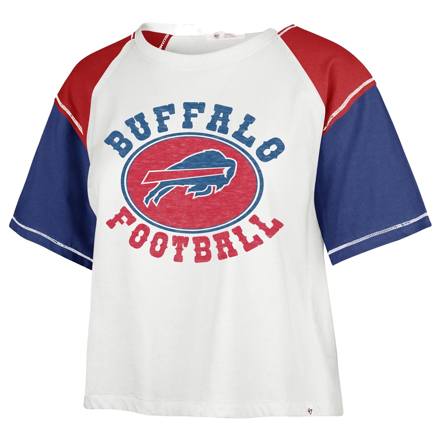 Grab the attention of your fellow fans in this Buffalo Bills Center Stage top by ’47! The color blocking sleeves and the classic front graphic on this moderate waist crop tee are sure to make it a ‘go-to’ this season.